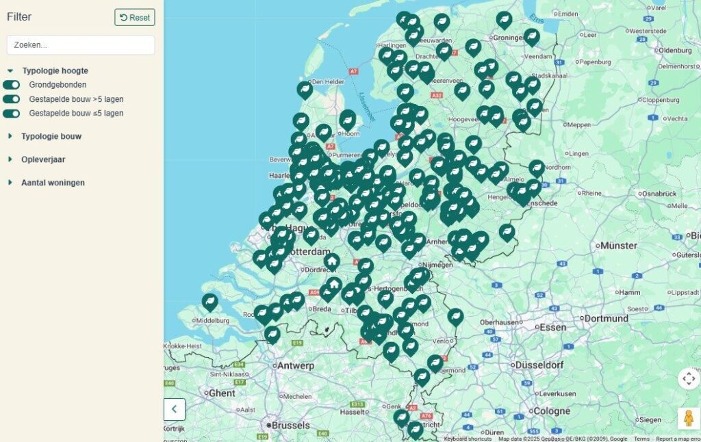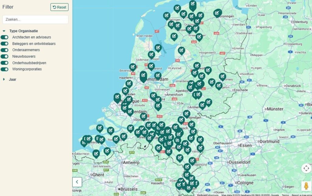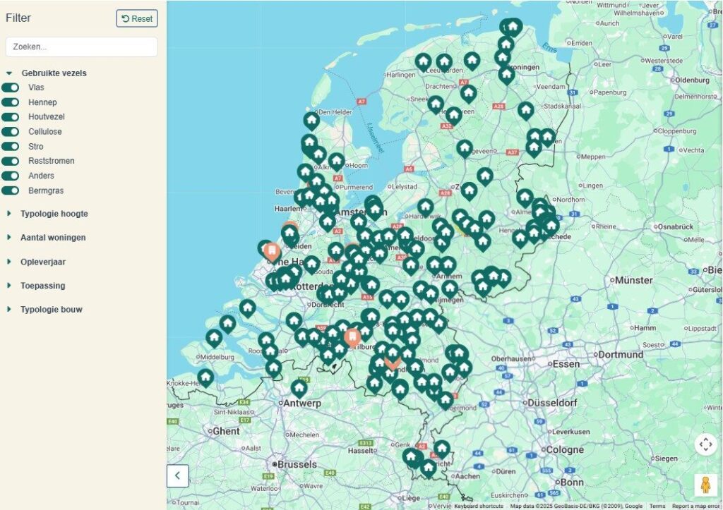 Deze biobased nieuwbouwprojectenlijst groeit met de dag! De kaart laat zien dat er al veel nieuwbouwprojecten gepland staan of reeds worden uitgevoerd.